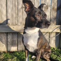 Simba is a big-eared brindle rat terrier mix. He has the cutest face and loves other dogs.