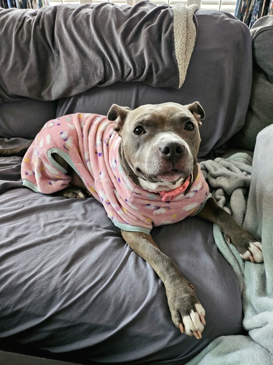 Alice is a great dog other than needing to be the only animal in the house. She does have allergies (chicken and fish), but these are managed easily by keeping her on a beef diet. She's calm and easy to please, and snoozes on the couch for most of the day.