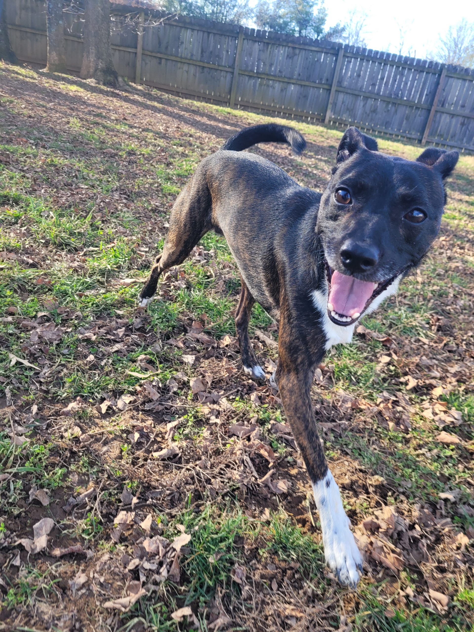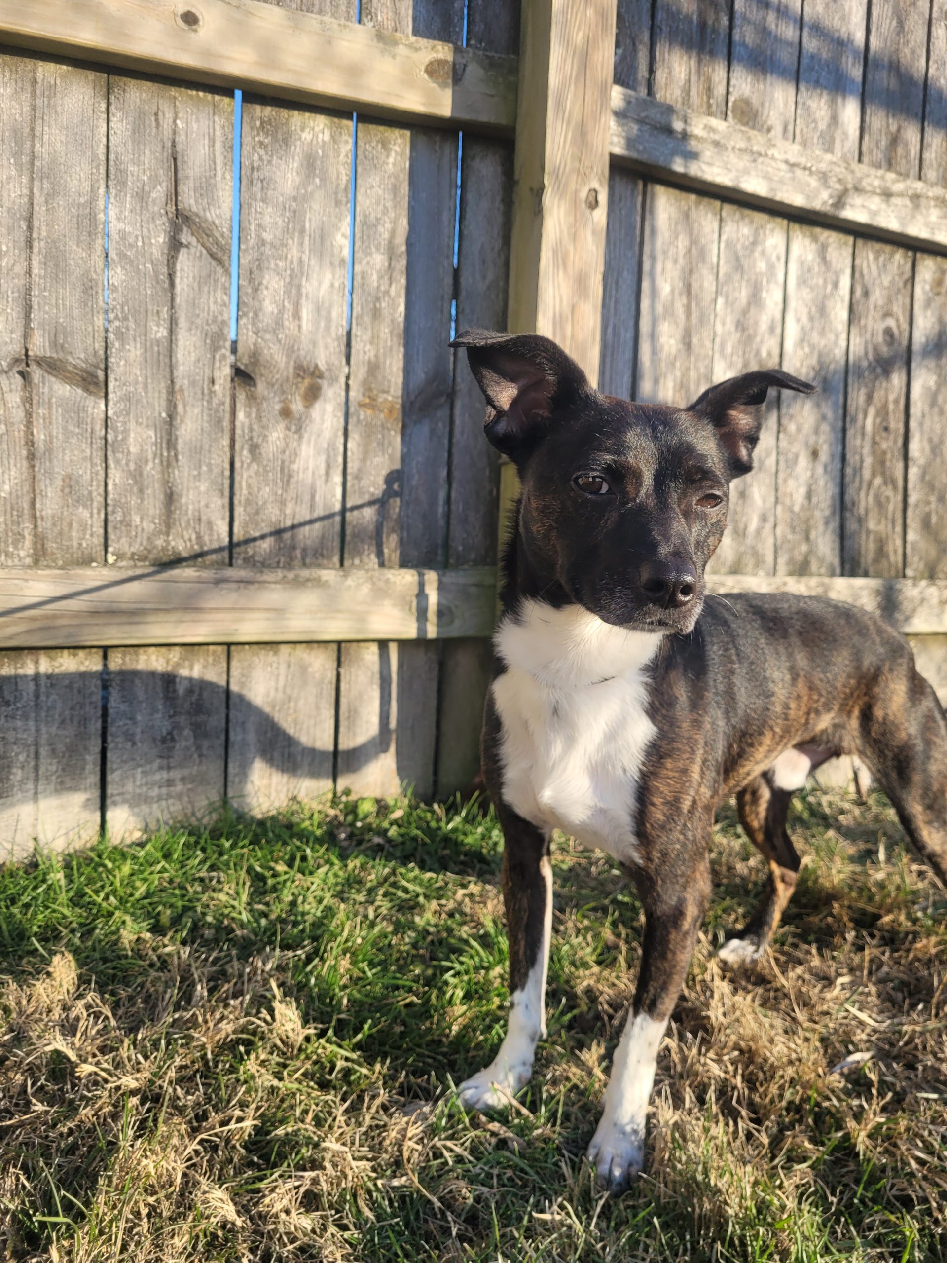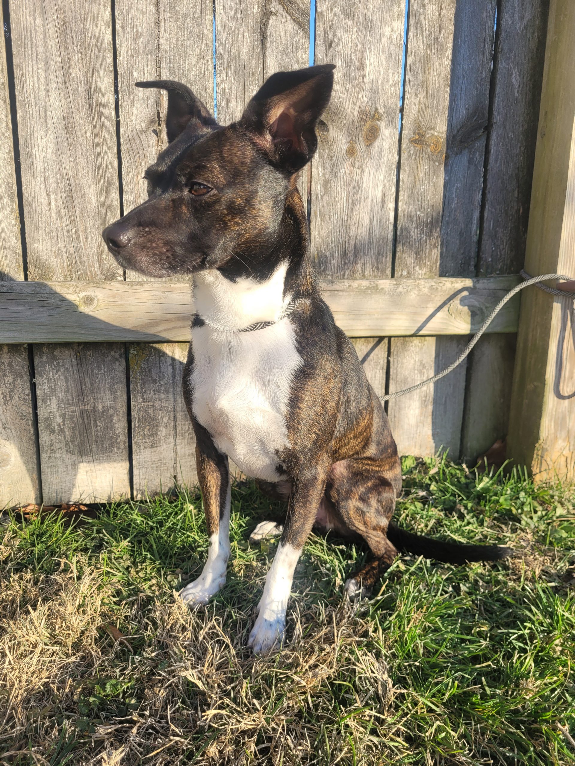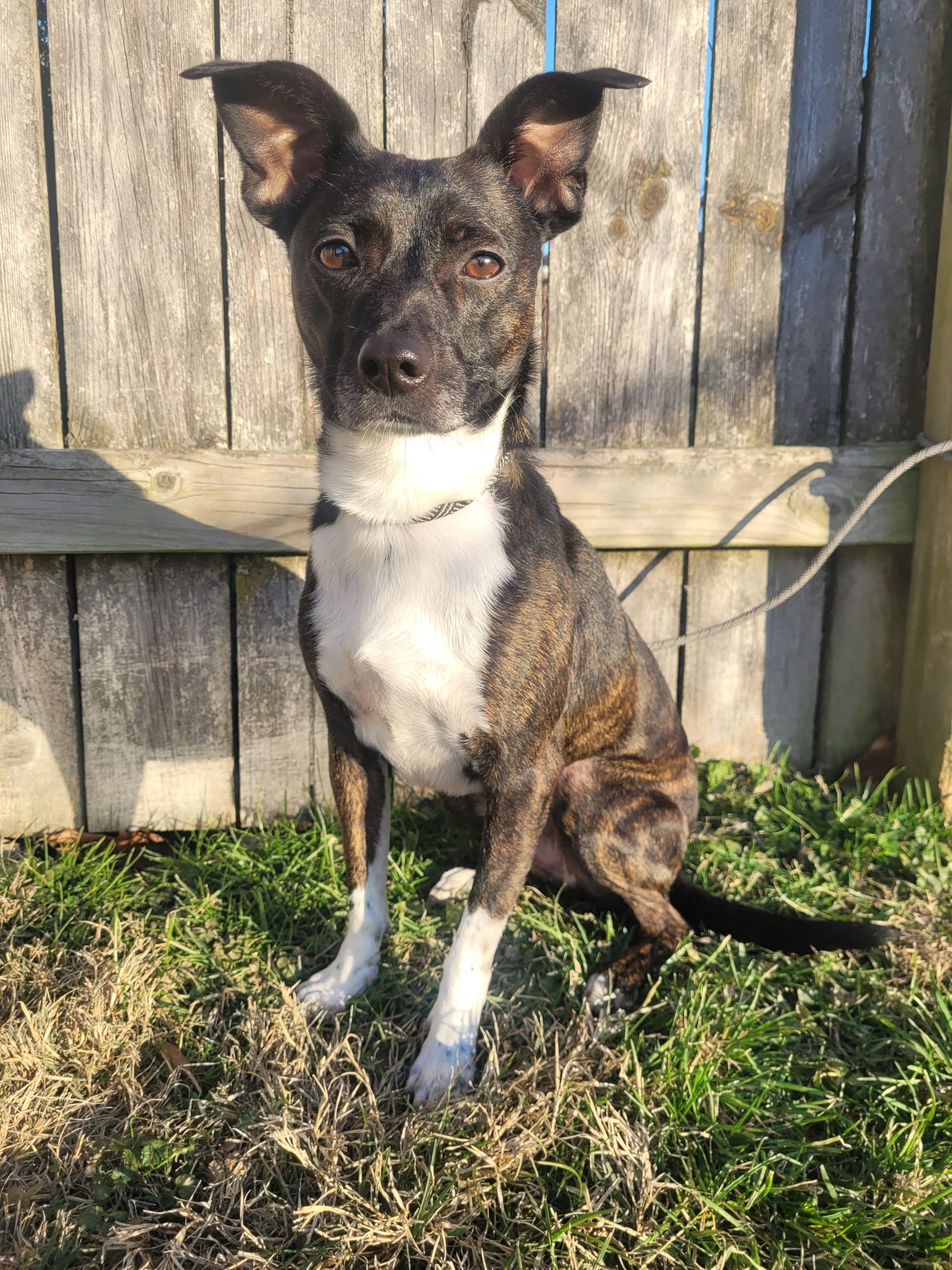 Simba is a four-year-old brindle rat terrier mix. He weighs around 25 pounds. He is coming out of his shell every day! He loves other dogs and is full of energy.