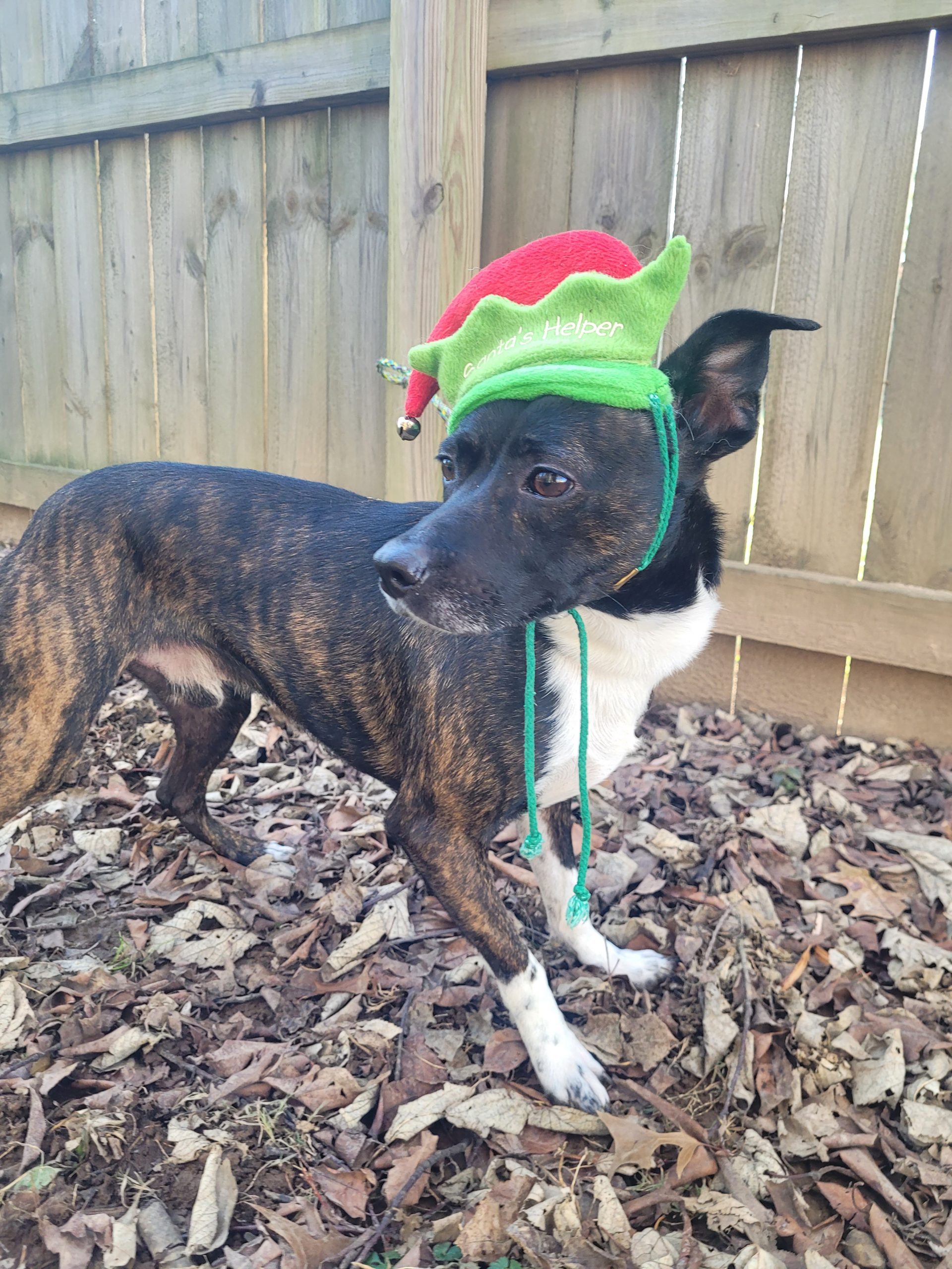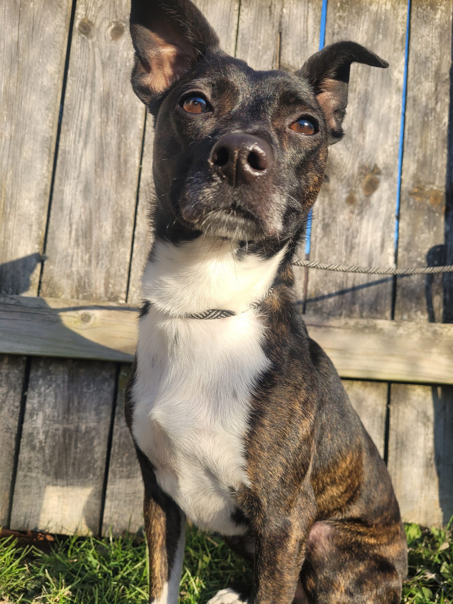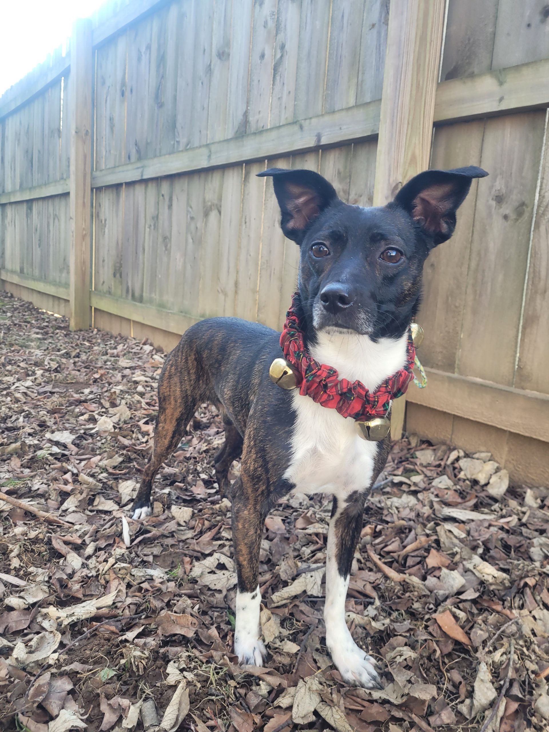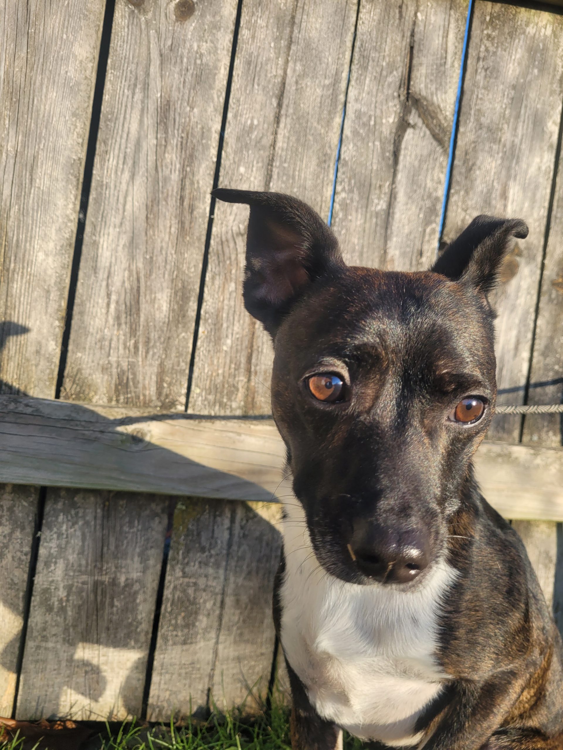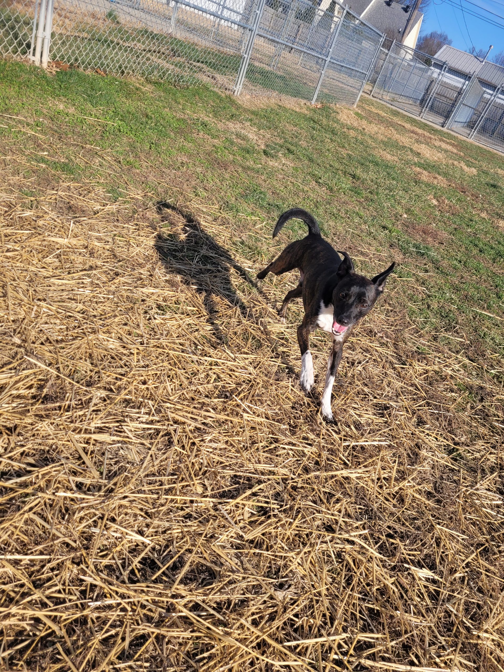 Simba is a four-year-old brindle rat terrier mix. He weighs around 25 pounds. He is coming out of his shell every day! He loves other dogs and is full of energy.