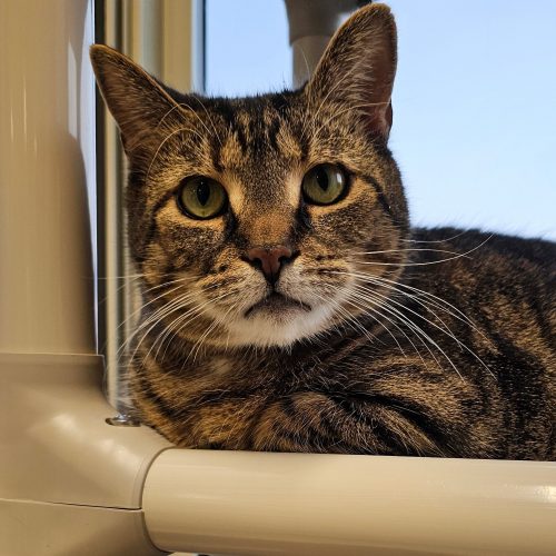 This pretty tabby girl is Kammi. She was born in April 2019. She and her sister Cola were rescued by a good Samaritan. Both cats experienced some trauma as kittens and were very scared for the first few weeks after coming to Life House. However, they have both made great strides. Kammi and Cola are bonded, and have shared a cat room, just the two of them, for most of their time at Life House.