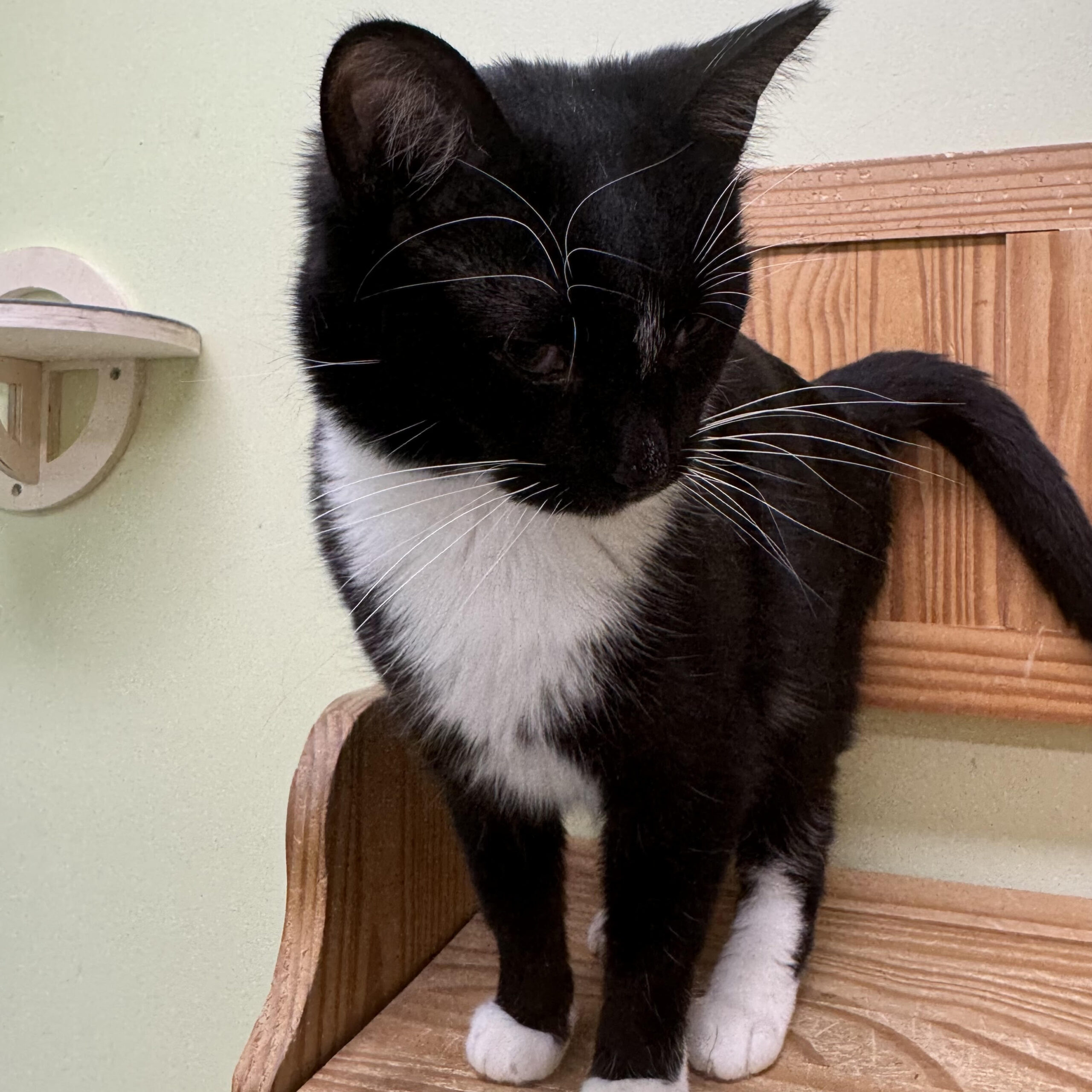 This petite tuxedo is Millie. She was born around 2016. Millie showed up as a stray or abandoned cat at the home of a good Samaritan who fed her and had her spayed through the TNR program. When this good Samaritan became terminally ill, she contacted LIFE House about taking Millie in.
