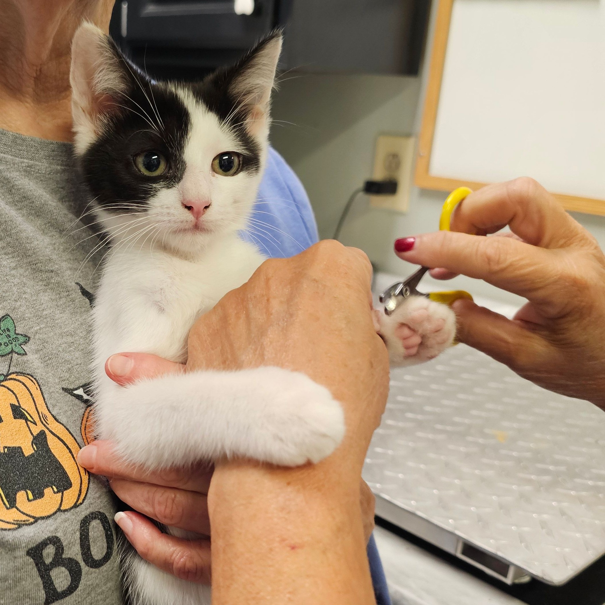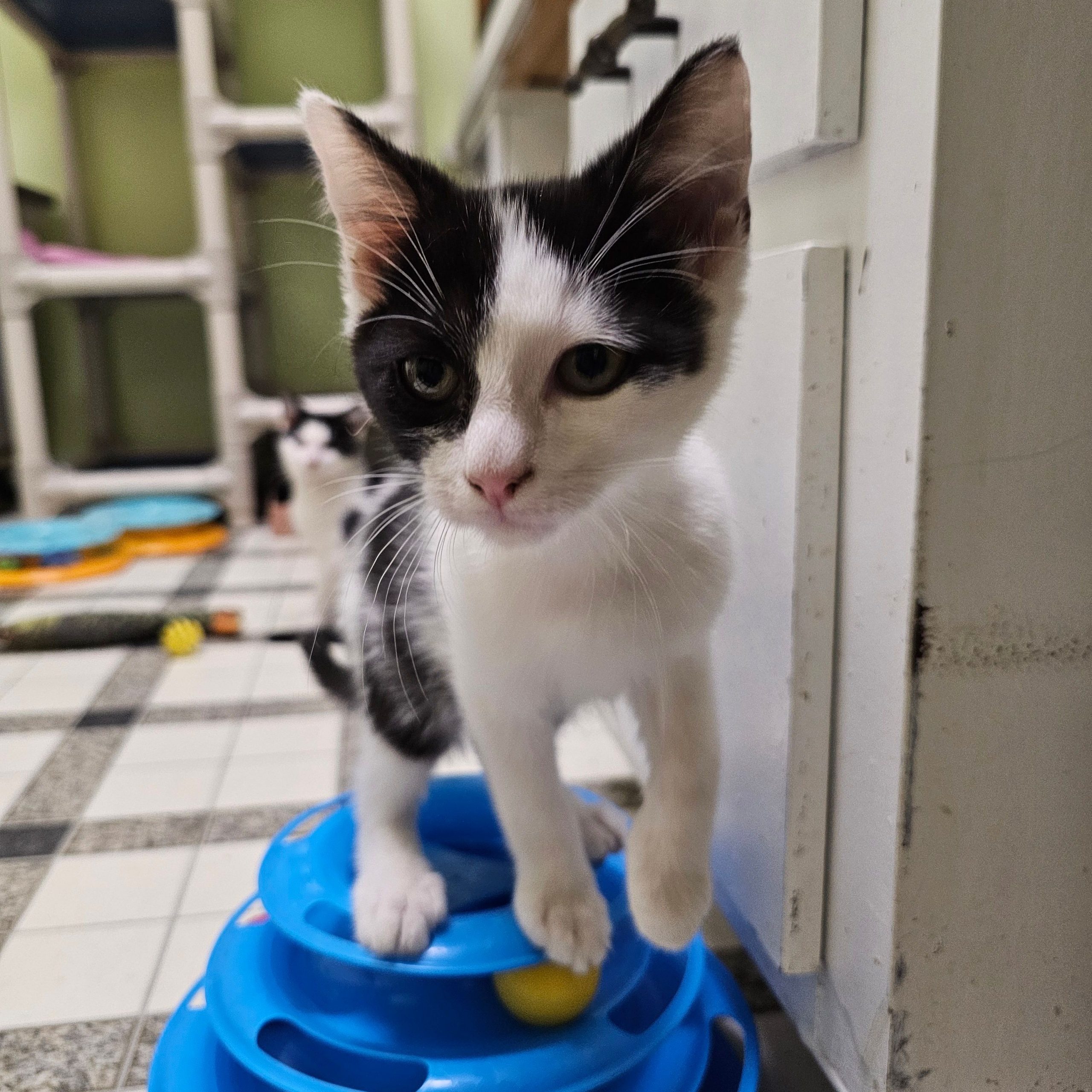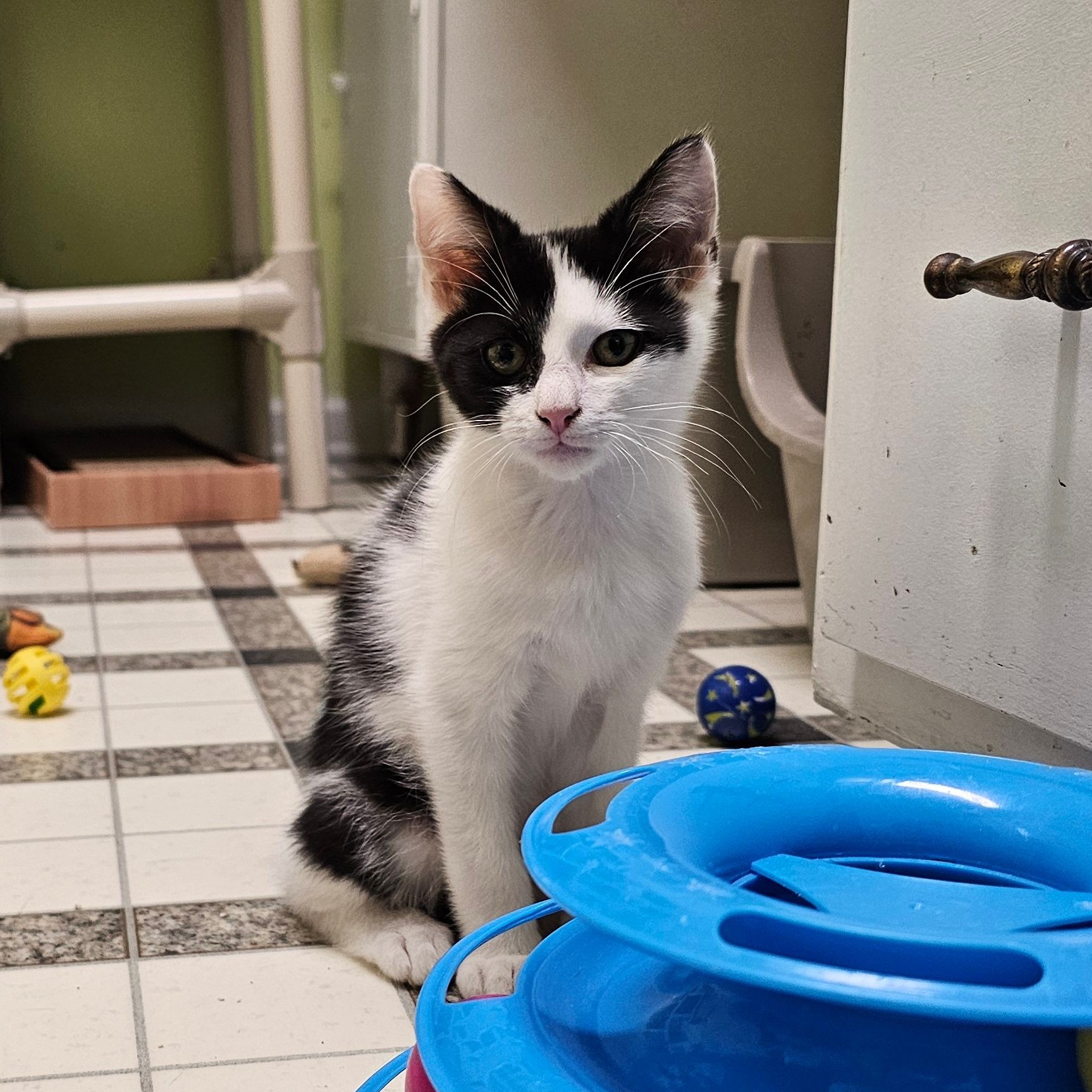 This is Tangerine.  He was born in late July 2025.  He and his brother, Blue, were taken in as tiny kittens when they were abandoned as tiny kittens around 3 weeks of age. They were bottlefed by the foster family who took them in, so they are very people-oriented.  They also get along well with the other kittens in their room.  If you are looking for a sweet natured kitten who loves people, you will love Tangerine.